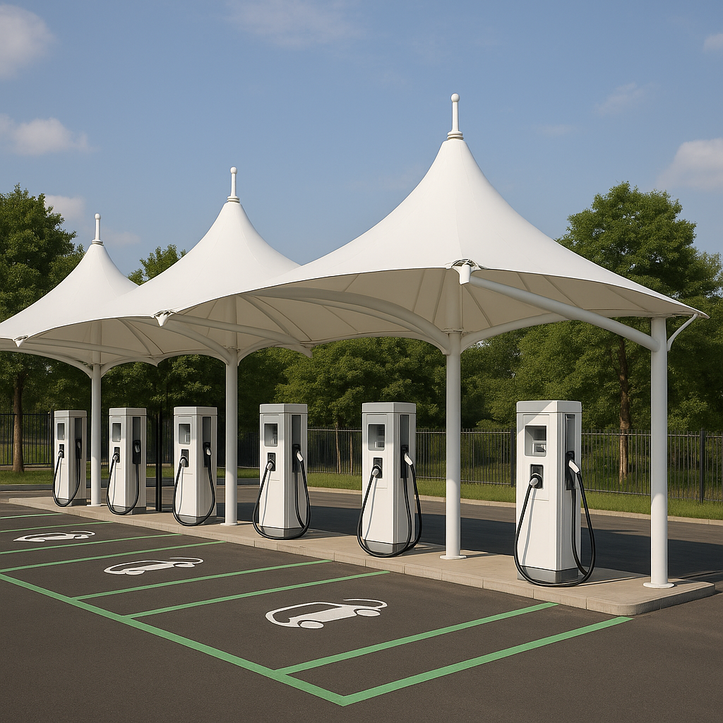 电动汽车膜结构充电站采用PTFE、PVDF、ETFE等膜材料,为充电区域上方或周围提供遮阳、防雨、防护等功能,将充电站与轻量化结构相结合,打造兼具实用性和美观性的新能源基础设施。