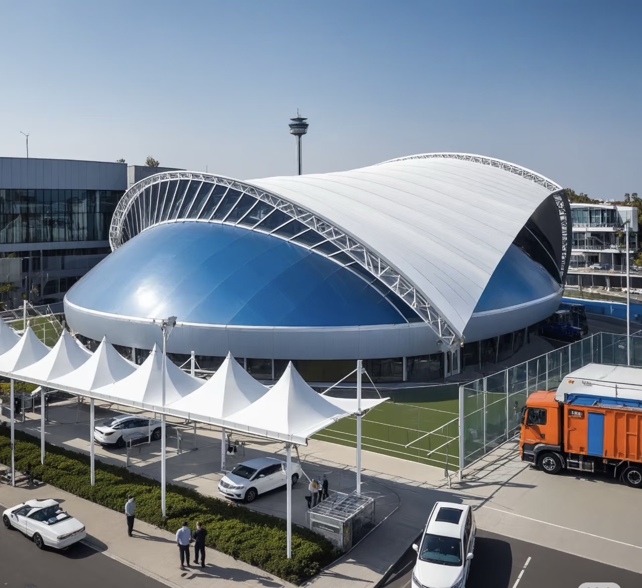 PVC membrane: 8–15 years;PTFE membrane: 15–30 years;Hot-dip galvanized steel structure for corrosion protection