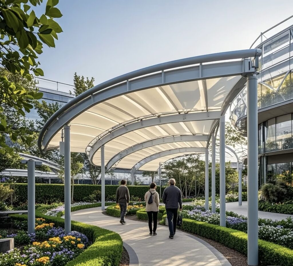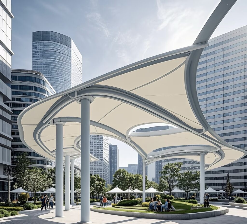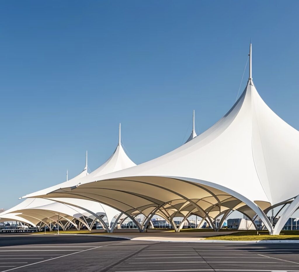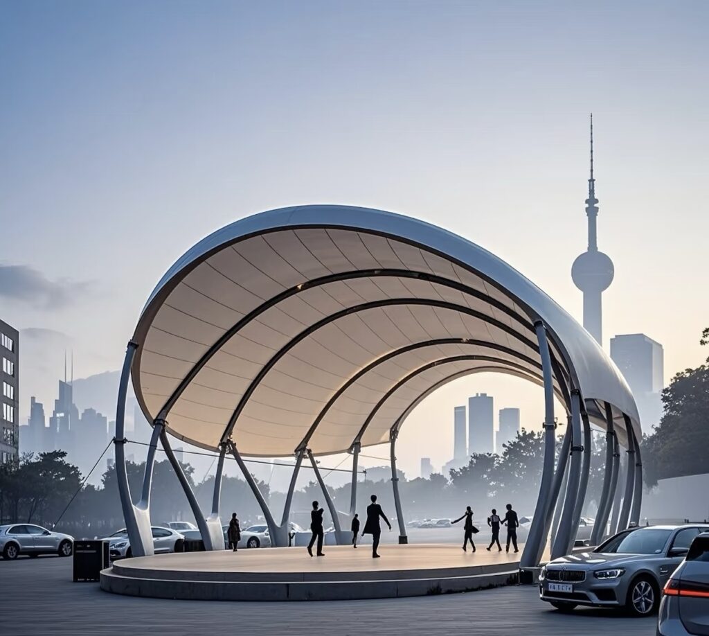 The membrane materials and related components of membrane structures are mostly prefabricated in factories, requiring only tensioning and installation on-site. This reduces wet work and construction waste, with a significantly shorter construction period compared to traditional buildings—often completed in just a few weeks, greatly saving time and labor costs. From a lifecycle cost perspective, their lightweight properties reduce the material usage for foundations and supporting structures, lowering costs by 15%-20%. Additionally, modern membrane materials possess excellent anti-aging, UV-resistant, and self-cleaning properties, eliminating the need for frequent maintenance over long-term use. Annual maintenance costs are far lower than those of traditional steel structure or other building forms.“`.
